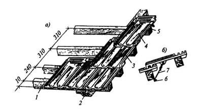 | Рис. 9.9. Покрытие ската кровли пазовой штампованной черепицей: а - начало укладки черепицы; б - крепление черепицы; 1 - карнизная обрешетка; 2 -стропильная нога; 3 - половина пазовой черепицы; 4 - целая черепица, 5 - обрешетка; б - гвоздь; 7 - проволока