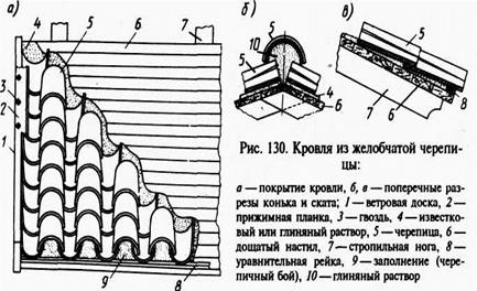 | Пазовую ленточную и штампованную черепицу укладывают только справа налево с нахлесткой в ряду соответственно 20-30 и нахлесткой рядов 65-70 мм. При неплотном прилегании черепицы нахлестку уплотняют цементно-известковым раствором. К обрешетке черепицу крепят проволокой через ряд или каждую в зависимости от уклона кровли.