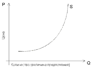 Рис. 5.1. Кривая предложения любого товара Исходя из анализа рис. 5.1 видим, что кривая предложения S ¾ восходящая. Это означает, что между ценой и величиной предложения ¾ прямая связь. Кривая предложения S показывает, какое количество товара и по какой цене производители могут продать на рынке. Кривая поднимается вверх, потому что, чем выше цена, тем большее число фирм имеет возможность производить и продавать товар. Более высокая цена дает возможность существующим фирмам расширить объем производства в короткий промежуток времени за счет привлечения дополнительного капитала, рабочей силы или сверхурочных работ, а в длительный промежуток времени ¾ за счет самого производства. Более высокая цена может также привлечь на рынок новые фирмы, у которых высоки издержки производства и продукция которых при низких ценах является нерентабельной.
