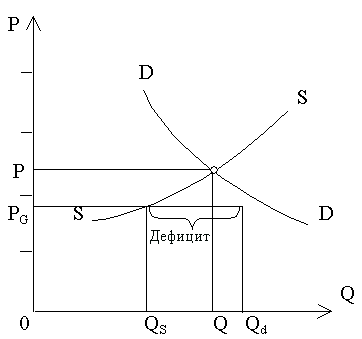 В некоторых случаях государство может законодательно устанавливать уровни цен: потолок цен и нижний уровень. Потолок цен представляет собой максимальную цену, которую продавцу разрешается запрашивать за свой товар или услугу. Это позволяет потребителям приобретать некоторые товары первой необходимости или услуги, которые они не смогли бы купить при равновесных ценах (рис. 6.5). Примером могут служить рентные платежи и норма процента, которую разрешается взимать с должников. В широких масштабах потолки цен, или общий контроль цен, применялись для ограничения инфляционных процессов в экономике. Из рис. 6.5 видно, что введение ценового потолка на тот или иной продукт (услугу), например, на уровне РС, приводит к возникновению устойчивого дефицита данной продукции, величина которого определяется отрезком QsQd. В связи с этим правительству приходится принимать на себя нормирование потребления данного продукта в интересах достижения более справедливого его распределения.