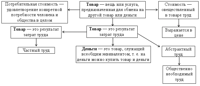 Схема 8.1. Товар и деньги: их взаимосвязь Это означает, что в результате исторического процесса развития обмена «деньги ¾ товары» стихийно выделились из всей массы товаров. Разумеется, в какое-то время имел место натуральный обмен,при котором один товар непосредственно обменивается на другой, или, по современной терминологии ¾ бартер. Но экономика не может долго развиваться в рамках натурального хозяйства. Неизбежно на смену ему приходит товарно-денежное хозяйство, или рыночная экономика. Общественное разделение труда и появление частной собственности ¾ основные причины зарождения рыночной экономики. Общественное разделение труда ¾ это специализация людей на выполнении тех или иных работ. Например, один тачает сапоги, другой печет пироги. Это и есть специализация, хотя и в упрощенной форме. Общественное разделение труда было бы немыслимо без «открытия» и последующего применения денег. Через деньги обнаруживается не только то, нужен ли вообще товар обществу или нет, но и то, в какой мере он нужен. Если, например, товар произведен в излишнем количестве, то при его продаже он будет приравнен к меньшему количеству денег, и таким путем товаропроизводитель обнаружит, что его труд был затрачен впустую. Деньги составляют основу рыночной экономики. Во всех цивилизациях товар продается за деньги, а затем на вырученную сумму покупается другой товар, который нужен для производства или личного потребления.