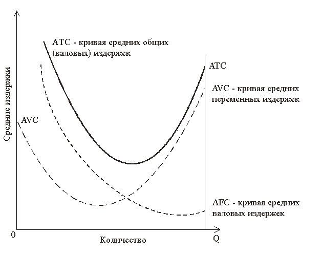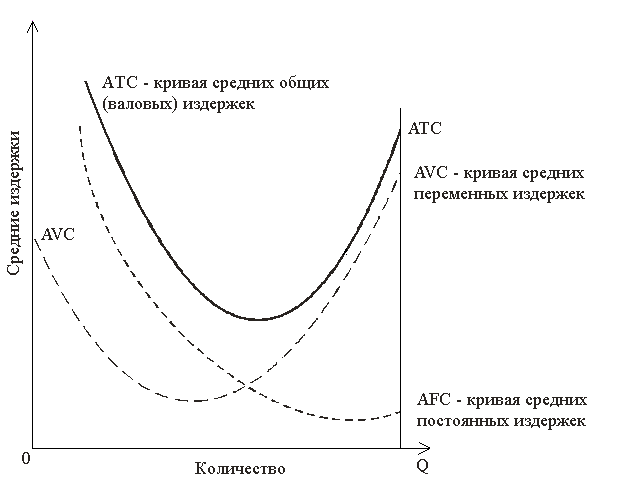 Рис. 15.1. График постоянных, переменных и валовых издержек Общие, или валовые, издержки (total cost, TC) ¾ издержки в целом при данном объеме производства. Они равны сумме постоянных и переменных издержек: ТС = FC + VC. Если наложить друг на друга кривые постоянных и переменных издержек, то получим новую кривую, отражающую общие издержки (см. рис. 15.1). Она обозначается линией ТС. Средние общие (average total cost, АТС,иногда называют АС)¾ это издержки в расчете на единицу продукции, т. е. общие издержки (ТС),деленные на количество произведенной продукции (Q):АТС= ТС/Q. Показатели средних общих издержек обычно используются для сравнения с ценой, которая всегда указывается в расчете на единицу продукции. Такое сравнение дает возможность определить величину прибыли, что позволяет определить тактику и стратегию фирмы в ближайшее время и на перспективу. Графически кривая средних общих (валовых) издержек изображается кривой АТС (см. рис. 15.2). Кривая средних издержек имеет U-образную форму. Это говорит о том, что средние издержки могут быть равны рыночной цене, а могут отклоняться от нее. Фирма рентабельна или прибыльна в том случае, если рыночная цена выше средних издержек.