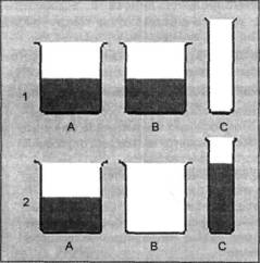 Объяснить смысл понятия «консервация» можно, описав эксперимент, который проводил Ж. Пиаже. На столе перед ребенком находится три сосуда (см. рисунок). Из них два одинаковые, а третий выше и уже. В два более низких сосуда наливают воду точно до одинакового уровня, то есть они содержат одинаковое количество воды. Затем воду из одного более низкого сосуда переливают в более высокий и узкий. В нем вода поднимается до более высокого уровня. Ребенку задают вопрос: «Больше ли воды в этом узком сосуде, чем ее было в низком?»