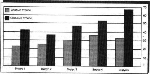 Исследования показали, что люди, испытывающие стресс, более других подвержены некоторым болезням и соматическим расстройствам. Каждодневные раздражающие факторы подтачивают силы и делают человека уязвимым для физических болезней. Стрессовые переживания могут ослаблять иммунную систему. В то время как стресс делает человека более уязвимым для болезни, сама болезнь часто приносит с собой дополнительные факторы стресса. На гистограмме представлена зависимость количества испытуемых, заболевших простудой после преднамеренного заражения пятью различными вирусами, от уровня стресса (Квинн В., 2000). Самой яркой демонстрацией связи между испытываемыми человеком эмоциями и подверженностью его инфекционным заболеваниям послужило исследование ученых из США и Великобритании. Оно показало, что высо-