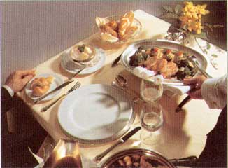 | Если блюдо занимает на тарелке более 2/3 места, то часть мяса перекладывают на спиртовку или плитку для подогрева. Она подается либо позже, либо кладется на свежую подогретую тарелку. Столовые приборы должны находиться на столе еще до подачи блюд. В порядке исключения пустые тарелки разрешается выставлять слева левой рукой, а наполненные - справа (обмен тарелок обычно происходит на банкетах государственного значения). Уборка и установка тарелок при поддержании их сверху с правой стороны - другой возможный вариант. При таком способе можно осуществлять транспортировку, деталирование блюд, их заправку и разделку на глазах у посетителей (Hors-d'oevre). Используются тележки для перевозки мяса и закусок из буфета.
