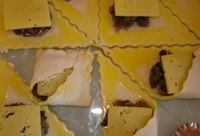 Приготовление: Из одного листа теста получается 8 квадратиков, 16 пирожков. Пирожки получаются небольшого размера, на 2-3 укуса, выглядят симпатично. По такому же принципу можно делать пирожки с капустной начинкой. Для начинки грибы обжарить с луком, добавив зелень и одну столовую ложку сметаны. 1. Тесто раскатать прямоугольными пластинами, нарезать сначала на квадраты, потом на треугольники. 2. Треугольники теста по сторонам смазать желтком немного разведенным водой.3. На середину каждого треугольника выкладываем чайную ложку грибной начинки. Сверху начинку накрываем квадратиком сыра. 4. Теперь берем острые уголки складываем их к прямому, друг на друга. По сторонам прижимаем. Серединку пирожка оставляем открытой. Сыр расплавится и "запечатает" пирожок. 5. Пирожки укладываем на противень, верх смазываем желтком. Выпекаем при температуре 190*.
