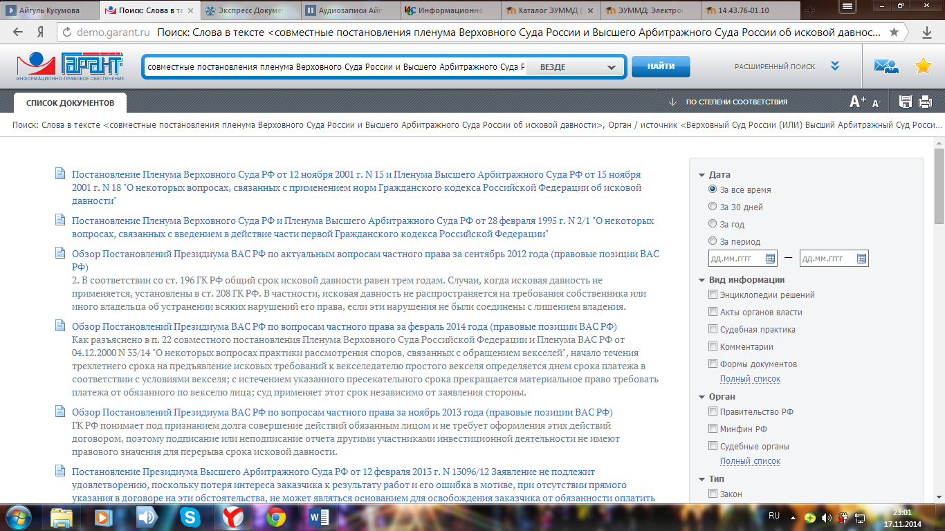 5. Воспользовавшись полем Орган/Источник карточки поиска, найдите совместные постановления пленума Верховного Суда России и Высшего Арбитражного Суда России об исковой давности.