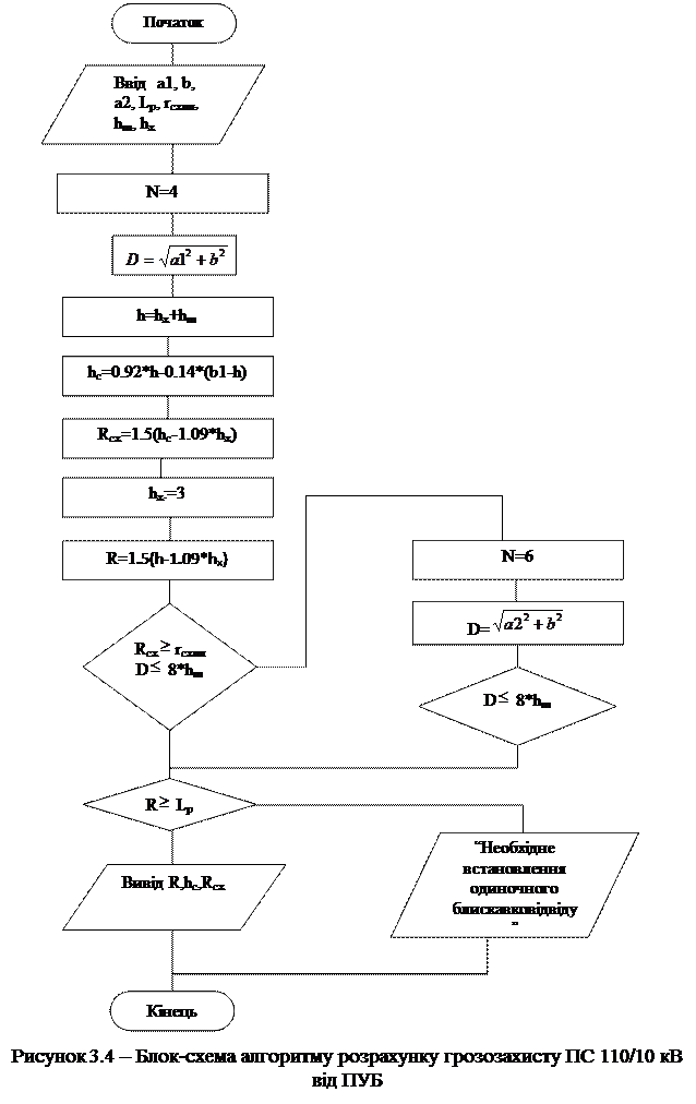 Виходячи з того, що встановлення чотирьох 8-метрових блискавковідводів забезпечує майже гранично мінімальну зону захисту, то встановлення двох 8-метрових блискавковідводів не забезпечить необхідний захист ПС. Встановлення 6 блискавковідводів також не є доцільним, тому що вимагає додаткових витрат. Оскільки блискавковідвід встановлено на порталі трансформатора, то, згідно ПУЕ, потрібна перевірка трансформатора на вплив імпульсного струму. Блок-схема алгоритму розрахунку захисту підстанції від ПУБ приведена на рисунку 3.4.