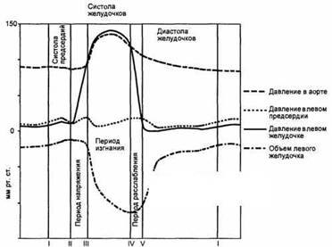 Работа сердца представляет собой непрерывное чередование периодов сокращения (систола) и расслабления (диастола). Сменяющие друг друга систола и диастола составляют сердечный цикл. Поскольку в покое частота сокращений сердца составляет 60—80 циклов в минуту, то каждый из них продолжается около 0,8 с. При этом 0,1 с занимает систола предсердий, 0,3 с — систола желудочков, а остальное время — общая диастола сердца. К началу систолы миокард расслаблен, а сердечные камеры заполнены кровью, поступающей из вен. Атриовентрикулярные клапаны в это время раскрыты и давление в предсердиях и желудочках практически одинаково. Генерация возбуждения в синоатриальном узле приводит к систоле предсердий, во время которой за счет разности давлений конечно-диастолический объем желудочков возрастает приблизительно на 15 %. С окончанием систолы предсердий давление в них понижается.