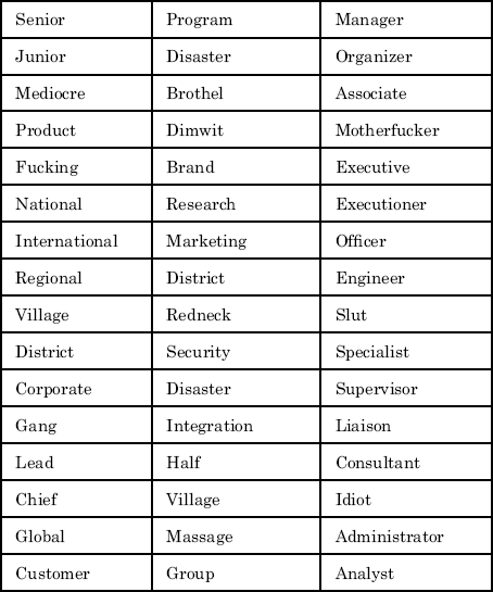 Подсказка. Неподходящее: Mediocre, Fucking, Village, Gang, Disaster, Brothel, Dimwit, Redneck, Half, Motherfucker, Executioner, Slut, Idiot, Superior, Subdivision, Massage, Geek, Scumbag, Quantity, Datalogger, Asswipe, Reprehensible, Stoned, Political. Ну, вот несколько примеров. Определите, какая должность может быть реальной, а какая – чисто шутка: 1. Senior Account Manager. 2. Investor Quality Producer. 3. Regional Massage Administrator. 4. Global Marketing Analyst. Кому трудно – учите английский – язык международного общения!