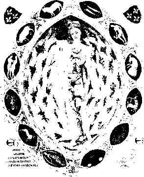 413 Таким образом, христианская проекция воздействует на непознанное в человеке, или на непознанного человека, который становится носителем "страшных неслыханных тайн" 31) С другой стороны, языческая проекция простирается далее человека и действует на непознанное в материальном мире, непознанная субстанция которого, как и искомый человек, каким-то образом заполняется Богом. И если в христианстве божественность воплощается в человеке низкого положения, то в "философии" она скрыта в непривлекательном камне. В христианской проекции descensus spiritus sancti* ограничивается живым, телом. Избранного, человека и Бога одновременно, тогда как в алхимии нисхождение осуществляется прямо в мрак неживой материи, чья низшая область, согласно неопифагорейским воззрениям, находится под властью зла.3' Зло и материя вместе составляют Диаду, дуализм (рис.156). Это сущность женской природы, anima mundi, женская Физис, которая жаждет объятий Единого, Монады, доброй и совершенной 3'- Юстиниан Гностик описывает ее как Эдем, полу-деву. полу-змею.33 (рис.157) Она мстительно состязается с пневмой, ибо в образе демиурга, второй формы Бога, он вероломно покинул ее. Она -"божественная душа, заключенная в элементах", спасти ее - задача алхимии.3'''