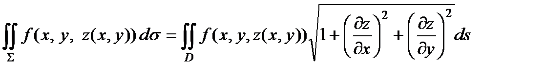 Вычисление поверхностного интеграла 1-го рода (по площади поверхности) сводится к вычислению двойного интеграла по проекции поверхности на какую-либо координатную плоскость. При проектировании поверхности