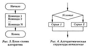 Одним из первых алгоритмических языков программирования был известный всем Бейсик (Basic), созданный в 1964 г. В настоящее время кроме Бейсика существует достаточно много языков программирования алгоритмического типа: Pascal, С и др. Язык программирования формируется на основе определенного алфавита и строгих правил построения предложений (синтаксиса). В алфавит языка могут входить буквы, цифры, математические символы, а также операторы, например Print (печать), Input (ввод) и др. С помощью алгоритмических языков программирования (их еще называют структурными языками программирования) любой алгоритм можно представить в виде последовательности основных алгоритмических структур: линейной, ветвления, цикла. Линейные алгоритмы. Линейные алгоритмы состоят из нескольких команд (операторов), которые должны быть выполнены последовательно одна за другой. Такие последовательности команд будем называть сериями. Чтобы сделать алгоритм более наглядным, часто используют блок-схемы. Различные элементы алгоритма изображаются с помощью различных геометрических фигур: начало и конец алгоритма обозначаются прямоугольниками с закругленными углами, а последовательности команд — прямоугольниками (рис. 3). Ветвление. В отличие от линейных алгоритмов, где команды выполняются последовательно одна за другой, в алгоритмические структуры ветвление входит условие, в зависимости от выполнения или невыполнения которого реализуется та или иная последовательность команд (серий) (рис. 4). Цикл. В алгоритмические структуры цикл входит серия команд, выполняемая многократно. Такая последовательность команд называется телом цикла. Циклические алгоритмические структуры бывают двух типов: — циклы со счетчиком, в которых тело цикла выполняется определенное количество раз (рис. 5); — циклы с условием, в которых тело цикла выполняется до тех пор, пока выполняется условие. Когда заранее известно, какое число повторений тела цикла необходимо выполнить, можно воспользоваться циклом со счетчиком. Однако часто бывает необходимо повторить тело цикла, но заранее неизвестно, какое количество раз это надо сделать. В таких случаях количество повторений зависит от выполнения некоторого условия. Условие выхода из цикла можно поставить в начале, перед телом цикла (рис. 6, а), или в конце, после тела цикла (рис. 6,b).