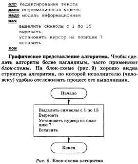 Алгоритм позволяет формализовать выполнение задачи. Предположим, что пользователю надо провести редактирование текста и из текста «информационная модель» получить текст «модель информационная». Запись алгоритма на естественном языке. Запишем необходимую последовательность действий, т. е. алгоритм Редактирование текста, на естественном языке9 который понятен человеку (пользователю компьютера): 1) выделить слово информационная + пробел; 2) вырезать этот фрагмент; 3) установить курсор на позицию после слова модель + пробел; 4) вставить фрагмент текста. Запись алгоритма на алгоритмическом языке. Каждая команда алгоритма должна однозначно определить действие исполнителя, т. е. алгоритм должен быть точным. Однако естественный язык не очень подходит для записи алгоритмов, так как не обладает достаточной строгостью и определенностью при записи команд. Для достижения необходимой точности и строгости алгоритм следует формализовать, т. е. записать на одном из формальных языков. В школьной информатике в качестве такого формального языка часто используют алгоритмический язык. Запишем алгоритм Редактирование текста на алгоритмическом языке: алг Редактирование текста дано информационная модель надо модель информационная нач выделить символы с 1 по 15 вырезать установить курсор на позицию 7 вставить кон Запись алгоритма на языке программирования. Чтобы исполнитель Компьютер мог автоматически выполнить алгоритм, он должен быть записан на понятном для этого исполнителя языке, т. е. на языке программирования. Запишем алгоритм Редактирование текста на языке VBA. Sub Редактирование{) Selection.MoveRight Unit:=wdCharacter, Count:=15, Extend:=wdExtend Selection.Cut Selection.MoveRight Unit:=wdCharacter, Selection.Paste End Sub