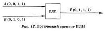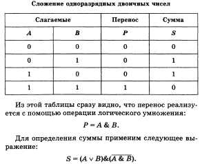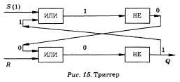 Поскольку любая логическая операция может быть представлена в виде комбинации трех базовых операций (И, ИЛИ, НЕ), любые устройства компьютера, производящие обработку или хранение информации, могут быть собраны из базовых логических элементов как из кирпичиков. Логический элемент И. На входы А и В логического элемента последовательно подаются четыре пары сигналов различных значений, на выходе получается последовательность из четырех сигналов, значения которых определяются в соответствии с таблицей истинности операции логического умножения (рис. 11). Логический элемент ИЛИ. На входы Аи В логического элемента последовательно подаются четыре пары сигналов различных значений, на выходе получается последовательность из четырех сигналов, значения которых определяются в соответствии с таблицей истинности операции логического сложения (рис. 12). Логический элемент НЕ. На вход А логического элемента последовательно подаются два сигнала, на выходе получается последовательность из двух сигналов, значения которых определяются в соответствии с таблицей истинности логического отрицания (рис. 13). Сумматор. В целях максимального упрощения работы компьютера все многообразие математических операций в процессоре сводится к сложению двоичных чисел. Поэтому главной частью процессора является сумматор, который обеспечивает такое сложение. При сложении двоичных чисел образуется сумма в данном разряде, при этом возможен перенос в старший разряд. Обозначим слагаемые (А, В), перенос (Р) и сумму (S). Построим таблицу сложения одноразрядных двоичных чисел с учетом переноса в старший разряд (табл. 4). Теперь, на основе полученного логического выражения, можно построить из базовых логических элементов схему полусумматора (рис. 14). Данная схема называется полусумматором, так как выполняет суммирование одноразрядных двоичных чисел без учета переноса из младшего разряда. Многоразрядный сумматор процессора состоит из полных одноразрядных сумматоров. На каждый разряд ставится одноразрядный сумматор, причем выход (перенос) сумматора младшего разряда подключен ко входу сумматора старшего разряда. Триггер. Важнейшей структурной единицей оперативной памяти компьютера, а также внутренних регистров процессора является триггер (рис. 15). Это устройство позволяет запоминать, хранить и считывать информацию (каждый триггер может хранить 1 бит информации). Для построения триггера достаточно двух логических элементов «ИЛИ» и двух элементов «НЕ». В обычном состоянии на входы триггера подан сигнал «О», и триггер хранит «О». Для записи «1» на вход S (установочный) подается сигнал «1». При последовательном рассмотрении прохождения сигнала по схеме видно, что триггер переходит в это состояние и будет устойчиво находиться в нем и после того, как сигнал на входе S исчезнет. Триггер запомнил «1», т. е. с выхода триггера Q можно считать «1». Чтобы сбросить информацию и подготовиться к приему новой, на вход R (сброс) подается сигнал «1», после чего триггер возвратится к исходному «нулевому» состоянию.