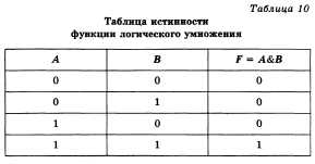 В алгебре логики объединение двух (или нескольких) высказываний в одно с помощью союза «и» называется операцией логического умножения или конъюнкцией. Составное высказывание, образованное в результате операции логического умножения (конъюнкции), истинно тогда и только тогда, когда истинны входящие в него простые высказывания. Операцию логического умножения (конъюнкцию) принято обозначать либо значками «л», «&», либо знаком умножения «•». Образуем составное высказывание F, которое получится в результате конъюнкции двух простых высказываний: F = A&B. С точки зрения алгебры высказываний мы записали формулу функции логического умножения, аргументами которой являются логические переменные А и Б, принимающие значения истина (1) и ложь (0). Сама функция логического умножения F также может принимать лишь два значения — истина (1) и ложь (0). Значение логической функции определяется с помощью таблицы истинности данной функции (табл. 10): По таблице истинности легко определить истинность составного высказывания, образованного с помощью операции логического умножения. Рассмотрим, например, составное высказывание Первое простое высказывание истинно (А = 1), а второе высказывание ложно (В = 0); по таблице определяем, что логическая функция принимает значение ложь (F = 0), т. е» данное составное высказывание ложно.