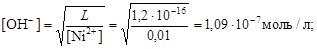 Пример 26. Вычислить рН гидратообразования для раствора сульфата никеля с концентрацией 0,01 моль/л ( Решение. Осадок гидроксида образуется из раствора NiSO4 в результате установления следующего равновесия: Ni(OH)2 ® Ni2+ + 2OH-. Гидратообразование начинается при условии [Ni2+]×[OH-]2 = L, откуда