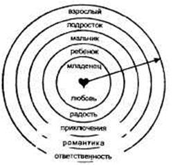Все импульсы к выходу вовне исходят из сердца. При таком расщеплении, если чувство любви сильное, элемент взрослости (эю) слабый. Если эго (взрослость) сильное, чувство любви слабое. Результатом является расщепление личности (рис. 10). Вместо целостной, способной к любви, радости, приключениям, романтике и ответственности личности, мы имеем человека с двумя различно действующими центрами существования. Один центр находится в области сердца и связан с чувством любви, веселостью, невинностью, радостью. Он очень 1 лубок у каждого человека. Другой центр, в котором доминирует эго, находится на поверхности - там, где происходит контакт с миром. Явления, связанные с ним, - это жажда высокою положения, стремление к достижениям и успехам, желание быть кем-то важным, придание слишком большой значимости социальному статусу. У здорового человека желания сердца и стремления эго не находятся в конфликте. Потребность в достижениях является зрелым проявлением удовольствия, получаемого ребенком в игре. Стремление к самовыражению имеет отношение к радости, которую ребенок получает в движении и творческой деятельности. Такая целостная личность представлена на рис. 11.