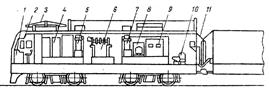 где Q и Р – соответственно масса состава и локомотива, т; Устройство электровоза. Кузов электровоза (рисунок 2.60)служит для размещения в нем электрической аппаратуры и другого оборудования. Он опирается на тележки, на которых установлены тяговые двигатели, по одному для каждой оси. С помощью зубчатого привода вращающий момент от тяговых двигателей передается колесным парам.