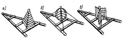 знаками русловые маяки дают возможность создать на водохранилищах непрерывную цепь знаков и огней для плавания судов. На семафорных мачтах вывешивают два типа фигур – треугольного и прямоугольного силуэта. Первый тип фигур имеет вид конуса, второй – цилиндра. Ночью конусу соответствует красный постоянный огонь, цилиндру – зеленый постоянный огонь. При этом на мачте обязательно должны быть вывешены одна под другой две фигуры. Если вверху вывешен цилиндр, а под ним конус, то это означает, что ход открыт для судов, идущих сверху. Ночью в данном случае вывешивают два фонаря: верхний – с зеленым постоянным огнем, нижний – с красным постоянным огнем. Если ход открыт для судов, идущих снизу, фигуры меняются местами (внизу цилиндр или зеленый постоянный огонь, а вверху конус или красный постоянный огонь). Когда движение судов по участку запрещено, на семафорной мачте вывешивают один под другим два конуса, ночью – два красных постоянных огня. На сигнальных мачтах вывешивают несколько типов фигур. Для обозначения глубин служат прямоугольная фигура, большой и малый шары. Прямоугольная фигура состоит из двух соединенных крестообразно (ребром) прямоугольных щитов. Она окрашивается в черный или белый цвет в зависимости от фона. Шары состоят из двух соединенных крестообразно дисков. Большой шар окрашивают в красный цвет, малый – в черный или белый цвет в зависимости от фона. Прямоугольная фигура обозначает глубину 100 см, большой шар – 20 см, малый шар – 5 см. Если глубина превышает в 1,25 раза наибольшую осадку плавающих по данному участку судов, то вместо перечисленных фигур на мачте вывешивают одну крестообразную фигуру черного или белого цвета. Для указания ширины судового хода служат ромбовидная фигура и те же большой и малый шары. Ромбовидная фигура состоит из двух щитов, имеющих форму ромба, соединенных крестообразно по большой диагонали. Она окрашивается в черный или белый цвет и обозначает ширину 50 м. Большой шар обозначает ширину 20 м, а малый – 5 м. На плавучие знаки всех типов и типоразмеров разработана подробная техническая документация. Плавучие знаки, сделанные из дерева, принято называть бакенами, а изготовленные из металла или пластмассы – буями. Это деление является условным и употребляется по традиции. Конструкция надстроек бакенов показана на рисунке 3.9. Надстройку треугольного силуэта делают в виде пирамиды: три бруска прикрепляют наклонно к штырю (головке) бакена, вторые их концы разводят в стороны, образуя ребра пирамиды. Бруски с трех сторон обшивают рейками с небольшими (1,5–2 см) просветами между ними. Для размещения электрических источников питания внутри пирамиды устраивают полку, а в обшивке одной из сторон делают дверку. Светосигнальный прибор надевают на штырь бакена. Круглая силуэтная фигура образуется из двух решетчатых дисков, соединенных крест-накрест. Диски собирают из реек и прибивают к стойке, верхний конец которой является штырем бакена. Просветы между рейками 1,5–2 см. Для прочности бакена от его вершины к углам плотика делают проволочные растяжки.
