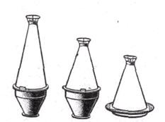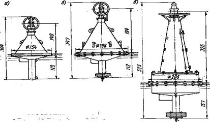 Рисунок 3.10 – Металлические буи: а – речной, б – озерно-речной, в – озерный Надстройка у буя 5-го типоразмера герметична, у буя 6-го типоразмера негерметична. Буй 5-го типоразмера имеет массу 430 кг, период собственных колебаний у него 3,5 с, метацентрическая высота 0,22 м. Буй 6-го типоразмера имеет массу 770 кг, период собственных колебаний 5,8 с и метацентрическую высоту 0,27 м. Углы качки на волне у обоих буев невелики, что является их положительным качеством. Масса якоря для буя 5-го типоразмера должна составлять 200 кг, калибр якорной цепи 13 мм. Масса якоря буя 6-го типоразмера должна быть около 300 кг, а калибр якорной цепи – 17 мм.