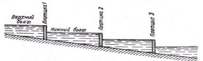 нижним бьефами; ворота, открывающиеся при выравненных бьефах; водопроводные устройства (отверстия или галереи) с соответствующими затворами для наполнения или опорожнения камеры; подходы к шлюзу с расположенными на них дамбами. Порядок шлюзования судна из верхнего бьефа в нижний следующий: при обоих закрытых воротах горизонт воды в камере выравнивается с помощью водопроводных галерей с горизонтом верхнего бьефа, после чего верхние ворота открываются и суда входят в камеру. Затем закрываются верхние ворота и затворы верхних водопроводных галерей, после чего открываются затворы нижних водоводных галерей. После выравнивания горизонта воды в камере с горизонтом воды в нижнем бьефе могут быть открыты нижние ворота и судно выведено из камеры в нижний бьеф. В том случае, когда несколько шлюзовании подряд производится в одном направлении, т. е. сверху вниз или снизу вверх, шлюзование называется односторонним; если же шлюзование происходит попеременно то вверх, то вниз, оно называется встречным. Размеры камеры шлюза определяются размерами и числом одновременно шлюзуемых судов, на которые рассчитывается шлюз. Шлюзы могут быть рассчитаны на пропуск одного судна максимальных размеров с буксиром или без него и на пропуск целого каравана судов. При этом расстояния между судами и между судами и габаритами шлюза принимаются по длине от 2 до 5 м, а по ширине – от 0,2 до 0,1 м. Разность между уровнями воды в нижнем и верхнем бьефах, называемая н а п о р о м, может быть различной колеблется для существующих сооружений в больших пределах, что оказывает большое влияние на конструкцию шлюзов. При значительных напорах, в целях уменьшения размера и веса нижних ворот, сооружаются шлюзы, имеющие несколько последовательно расположенных камер. Такие шлюзы называются многокамерными. Общий напор в многокамерном шлюзе делится между всеми камерами поровну. Для увеличения пропускной способности водного пути на шлюзуемом участке устраиваются две или три нити параллельно располагаемых шлюзов. В этом случае получаются парные шлюзы. На рисунке 3.19 показан внешний вид Городецкого шлюза, состоящего из двух пар однокамерных шлюзов, разделенных межшлюзовым бьефом,