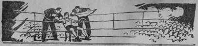 В ближнем бою типовые удары почти не используются. Чаще применяются короткие одиночные или серийные удары сбоку, снизу. Имеют место и видоизмененные короткие прямые удары (рис. 20). Защита в ближнем бою слагается в основном из отбивов, подставок, уклонов и нырков. Кроме того в ближнем бою используются защиты при помощи толчков руками в плечи бьющих рук противника, что смягчает удары и сковывает действия атакующего. Удары с ближней дистанции быстры, неожиданны и действенны. Во время ближнего боя бывает трудно уследить за акцентированными ударами нападающего и порой приходится их предугадывать за счет мышечного чутья. Защиту здесь следует применять в собранной низкой стойке, в противном случае защитные действия могут пробиваться ударами. Ближний бой обычно является решающим в достижении победы на ринге, поэтому на освоение его следует, обратить особое внимание — каждый боксер должен уметь и быть готовым вести ближний бой, отлично защищаться в нем. Кроме этого систематическая тренировочная работа в ближней дистанции вырабатывает и повышает у боксера специальную выносливость. Недостаточное умение действовать в ближнем бою обедняет арсенал боевых средств, лишает его во время боя уверенности в своих силах. Тактика ближнего боя в основном слагается из правильного выбора и поддержания нужной боксеру дистанции, в которой он успешнее может использовать свои боевые средства, индивидуальные особенности и качества. Исходное положение перед входом в ближний бой должно преследовать цель наибольшего удобства для нанесения коротких ударов. Для этого боксер попеременно переносит вес тела с ноги на ногу и этим выравнивает дистанцию. Стойка при исходном положении и во время ведения боя должна быть более фронтальной, руки находятся перед грудью, голова опущена на грудь, вес тела равномерно размещен на обеих ногах. С целью маскировки сближения с противником для атаки с ближней дистанций боксерам следует применять сменные передвижения влево и вправо и финтующие движения туловища типа нырков и уклонов с обманными ударами с обеих рук (угроза боковыми ударами). Самый вход в ближний бой — очень ответственный момент боя, так как сближаясь с противником, ведущим бой на дальней дистанции, боксер всегда рискует получить встречные удары, особенно левые прямые в голову. Чтобы смело и оправданно входить в ближнюю дистанцию, боксер должен в совершенстве овладеть такими активными защитными действиями как отбивы левой и правой рукой, уклоны и нырки, соединенные с шагом вперед. Вход в ближний бой возможен после применения указанных выше защит в момент собственной атаки и контратаки с дальней дистанции. Но атака или контратака с дальней дистанции создает возможность перехода в ближний бой в том случае, если она успешно начата. После сближения с противником боксеру необходимо на какой-то срок сохранить ближнюю дистанцию для успешного действия. В таких случаях следует преследовать противника по рингу, не отпуская его ни на шаг, загоняя его к канатам или в угол ринга. Основным условием развития ближнего боя должно быть сохранение ближней дистанции для нанесения задуманных ударов, что, в свою очередь, требует сохранения устойчивого положения боксера с опорой на обе ноги. Ничто не должно вывести его из равновесия — ни промахи, ни толчки, ни захваты и