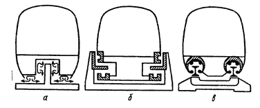 Рисунок 9.8 – Системы подвешивания экипажей: а – на воздушной подушке (смазке); б – на электромагнитном притяжении; в – на электродинамическом отталкивании