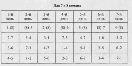 ру. Например, играют 7 команд. Следующую за 7-й четную цифру 8 делят на 2 и пишут столбиками цифры, начиная со второй половины, т.е. с 5: 5. 6. 7. При четном числе команд-участниц последнюю цифру не пишут. Рядом с написанным таким образом столбцом цифр проводят вертикальную линию и под ней пишут цифру 1, а в столбике (снизу вверх) - следующие по порядку цифры 2, 3, 4. Вновь проводят вертикальную линию и над ней пишут очередную цифру (в данном случае - 5) и т. д., помещая очередную цифру то под линией, то над ней и так до тех пор, пока не возникает необходимость поставить цифру 1 над линией. Цифры, которые окажутся под и над линиями, при нечетном числе команд-участниц показывают номера команд, свободных в данный игровой день от выступлений. Если число команд-участниц четное, эти цифры образуют с последней четной одну из пар данного игрового дня. Например: 1-8,8-5,2-8,8-6 ит.д. Цифры, расположенные по обе стороны каждой линии, показывают номера игровых пар; причем цифры справа от линии обозна-