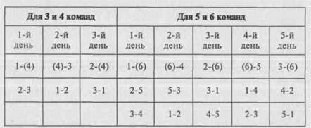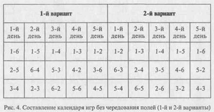 чают номера команд, играющих на своих площадках, а цифры слева - номера команд, играющих на полях соперников. Цифры под линиями также обозначают команды, играющие на своих полях; цифры над линиями - команды, играющие на полях соперников. Каждая пара соседних столбиков образует очередной игровой день. Способ без чередования полей применяется, когда соревнования проводятся на одних и тех же сооружениях. Таблица составляется для четного количества команд, при нечетном последнюю «четную» цифру заменяет ноль. Все участвующие команды делятся на два столбца пополам: первая половина записывается сверху вниз, вторая снизу вверх. Номера попарно составляют первый игровой день. Для определения последующих дней и пар производят передвижение номеров против