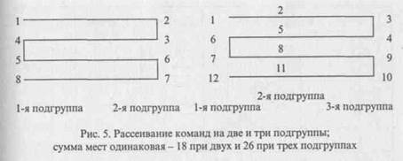 часовой стрелки, оставляя первый номер на месте. Может быть два варианта расположения номеров (рис. 4). При нечетном количестве команд, например 5, вместо номера 6 проставляется 0 - команда в этой паре не играет (выходная). При большом количестве команд и ограниченном времени соревнования проводятся в два этапа: предварительные и финальные игры. Например, 18 команд делятся на три подгруппы по 6 команд. Занявшие 1-2-е место в подгруппах образуют финальную группу, где разыгрываются 1-6-е место. Занявшие 3-е и 4-е места разыгрывают 7-12-е места и занявшие 5-6-е место разыгрывают места с 13-го по 18-е. Можно разделить на 6 подгрупп по 3 команды. Занявшие первые места разыгрывают места с 1-го по 6-е, вторые -с 7-го по 12-е, третьи места - с 13-го по 18-е. Результаты предварительных игр засчитываются в финале. Для участия в финале жеребьевка проводится таким образом, что в первый игровой день включаются в пары сыгравшие команды в предварительных играх и этот день считается сыгранным. Все последующие дни календаря составляются по описанным выше способам с учетом номеров, полученных при жеребьевке. По этому принципу составляются финальные группы для определения последующих мест. Для распределения команд по подгруппам, примерно равных по силам, применяют способ «рассеивания»: по жребию или «змейкой» с учетом результатов предыдущих соревнований (прошлогодних и др.). Рассеивание жребием, например, на три подгруппы: 1, 2 и 3 места рассеиваются жребием по этим подгруппам, затем так же 4, 5 и 6 места и т.д. Для всех остальных проводится общая жеребьевка. Рассеивание змейкой производится следующим образом: на основании занятых мест на предыдущих (прошлогодних), например 8 команд на две и три подгруппы (рис. 5). В спортивных играх результаты соревнований определяются по сумме набранных очков в соответствии с оценочными шкалами: начисление очков за победу, ничью (в играх, где это возможно), поражение и неявку на соревнование. При наличии ничьих возможны варианты: первый - за победу - 3 очка, ничью - 2, поражение -1 и неявка - 0; второй - за победу - 2, ничью - 1, поражение и неявка - 0. В играх, где ничьих не может быть: за победу - 2 очка, поражение - 1 и неявка - 0. В спортивных играх проводятся соревнования, в которых участвует несколько команд («клубный зачет») - две и больше, например студенческих; детско-юношеских - несколько возрастных групп; взрослых и детско-юношеских и т.п. Победителем считается коллектив, в сумме набравший большее количество очков. Возможен при этом зачет по каждой категории команд в отдельности. При клубном зачете старшие (по возрасту, уровню подготовленности) получают большее количество очков, например, при четырех командах первая за победу получает 4 очка, вторая - 3, третья - 2 и четвертая -1. Возможен вариант, когда команды разделяют 2 очка, при четырех командах это 8, 6, 4 и 2. За ничьи начисляется половина очков, в первом случае 2; 1,5; 1,0; 0,5 очка соответственно. За поражение и неявку команда не получает очков (0). Варианты начисления очков могут использоваться, например, для стимулирования подготовки юных спортсменов, в этом случае за победу детско-юношеским командам начисляется столько же очков, сколько взрослым и т.п. Для учета результатов соревнований по круговому способу применяется таблица, в которой отражается вся необходимая информация с учетом специфики спортивной игры (