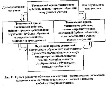 3.1. Основы теории обучения навыкам игры в спортивных играх Обучение в единстве с воспитанием составляют основу образовательного процесса в любой области, в том числе в физическом воспитании и спорте. 3.1.1. Характеристика обучения Обучение - организованный, планомерно и систематически осуществляемый процесс совместной деятельности обучающего и обучаемого с целью формирования познавательной деятельности, элементов мировоззрения, будущей профессиональной, учебной или спортивной деятельности, овладения знаниями, умениями и навыками. В этом процессе обучающий (педагог, тренер) и обучаемый (учащийся, студент, спортсмен) - субъекты обучения. В процессе четко выделены два вида деятельности: преподавание и учение (рис. 11). Преподавание - деятельность обучающего по отбору знаний, умений, навыков, необходимой информации и управлению процес-