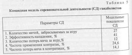 ративной. В деятельности гандболиста особое место занимает последняя. Оперативная память используется непосредственно для сохранения воспринятой информации в течение очень короткого времени или для того, чтобы вызвать в сознании некоторую часть информации из долгосрочной. Ведь гандболисту приходится запоминать множество схем тактических действий в тренировке. Во время соревнований он неожиданно находит интересные решения игровых задач, которые его память обязана сохранить и воспроизвести в нужный момент. При возрастании интенсивности игровых действий, при взаимодействии в условиях дефицита времени очень важны психические функции, которые обеспечивают переработку информации, прогнозирование дальнейшего хода ситуации. Прежде всего, это оперативное мышление, которое имеет непосредственное отношение к переработке информации. Тактические решения - это плод оперативной мыслительной деятельности. В ситуации выбора игрок мгновенно перебирает несколько вариантов и применяет тот, который более всего, по его мнению, согласуется с данной обстановкой. В основном гандболисты выбирают вариант из числа известных и ранее изученных, однако оперативное мышление включает в себя и элементы творческого мышления. К профессионально значимым свойствам личности гандболиста относят интенсивность и концентрацию внимания, его устойчивость и быстроту переключения. Особенно большие требования гандбол предъявляет к вниманию вратаря. Броски мастеров этой игры отличаются неожиданностью и стремительной скоростью (до 100 км/ч) полета мяча. Мяч, по данным Е. И.Ивахина, летит до ворот с расстояния 6 м всего 0,31 с. Чтобы среагировать на бросок нападающего, вратарь должен следить за мячом непрерывно на протяжении всей атаки противника. Но время, требуемое для задержания мяча вратарем, составляет примерно 0,8 с. Сравнение времени полета мяча до ворот и времени выполнения приема вратарем показывает необходимость прогнозировать направление полета мяча, чтобы его отразить. Примечание. Эффективность нападения - это отношение всех заброшенных мячей ко всем проведенным атакам. Частота применения контратак - это % контратак от всех атак. Частота потерь мяча в контратаках - это % от числа контратак. Эффективность контратак - это отношение всех заброшенных с контратак мячей к общему числу контратак. Частота потерь в позиционном нападении - это % от числа атак в позиционном нападении. Эффективность позиционного нападения - это отношение заброшенных с позиционного нападения мячей к общему числу атак. Результативность бросков - это % голов от общего количества бросков. Эффективность защиты - это отношение всех заброшенных противником мячей к общему количеству его атак. Для осуществления соревновательной деятельности (табл. 5) необходимы определенные функциональные возможности организма спортсмена. Соревновательная деятельность гандболиста требует аэробно-анаэробного энергообеспечения. Однако уровень специальной выносливости определяется не только системой энергообеспечения. Он зависит от деятельности центральной нервной системы, эндокринной системы, состояния опорно-двигательного аппарата, специфических внутримышечных изменений. Исследования двигательной деятельности гандболистов показывают, что мастера гандбола за игру преодолевают рас