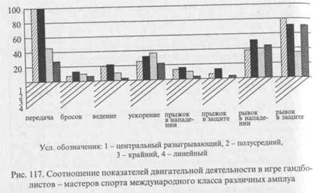 от 4900 до 6700 м, из них при переходе от нападения к защите -3700-4900 м, при позиционном нападении - 600-900 м, при игре в защите - 580-900 м. По амплуа: разыгрывающий пробегает короткими отрезками 890 м, полусредний - 660, крайний - 540, линейный - 480 м. В защите соответственно игроки преодолевают расстояние 730, 560, 406 и 620 м; при выходах на игрока с мячом - 250, 210,220 и 232 м. Отмечается низкая активность крайнего защитника как при выходах к игроку, так и при общих перемещениях. Большое расхождение наблюдается и в количестве передач. Центральный разыгрывающий и полусредний передают мяч в 2-3 раза чаще, чем крайний, и в 6-8 раз чаще, чем линейный. На центральных позициях в обороне защитники выполняют от 50 до 120 рывков, разрушая согласованные действия нападающих (рис. 117). Данные, полученные на чемпионатах мира, Олимпийских играх с участием сборной команды страны, характеризуются как показатели мастеров спорта международного класса (МСМК); данные, полученные на первенстве страны высшей лиги, - как показатели мастеров спорта (МС); результаты, зарегистрированные на первенстве страны среди старших юношей, - как показатели перворазрядников. Эта градация одинакова для мужчин и женщин. Таблица 6 демонстрирует показатели двигательной деятельности команд разного пола и квалификации. С увеличением квалификации команды возрастает интенсивность перемещения в игре. На рисунке 118 показано соотношение выполнения приемов гандболистами разного пола и квалификации. В состав команды гандболистов входят игроки пяти амплуа. Это вратарь и игроки в поле: разыгрывающий, полусредний, линейный