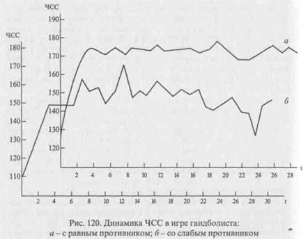 Соревнования гандболистов проходят без остановки времени. Однако двигательная деятельность в гандболе имеет прерывистый характер. С помощью хронометража выявлены активные и пассивные фазы в деятельности отдельных игроков. В играх с равным противником пассивные фазы короче, чем во встречах со слабым, активные почти не меняются. Во всех играх активные фазы до 5 с встречаются наиболее часто и составляют 40-65% общей величины фаз. Фазы длительностью от 5 до 10 с составляют 25-35%, а длительностью от 10 до 15 с- 10-20%. Пассивные фазы длительностью до 5 с составляют 40-50%, от 5 до 10 с-12-31%, а от 10 до 15 с-5-17%. Таким образом, двигательная деятельность гандболистов и гандболисток представляет собой чередование работы и отдыха в пределах 5-20 с и может быть охарактеризована как интервальная работа. Это очень важный фактор соревновательной деятельности гандболистов. Зная чередование интервалов работы и отдыха в игре, можно создавать упражнения, по направленности и нагрузке моделирующие соревновательную деятельность. Важный показатель функционального состояния организма -сердечно-сосудистая система. Частота сердечных сокращений (ЧСС) является важнейшим кардиологическим критерием, отражающим степень физиологической нагрузки. Величину соревновательной нагрузки можно определить по ЧСС во время игры и в период восстановления после встречи (рис. 119). Начинают встречу спортсмены при ЧСС 130-150 уд./мин. Уже к третьей минуте сердце игрока сокращается 174-186 раз в 1 мин, что свидетельствует об активном включении в игру. Максимальные значения ЧСС наблюдаются у игрока после нескольких ускорений и при единоборстве с нападающим, владеющим мячом. Средняя частота пульса в игре гандболистов не превышает 182 уд./мин. На величину пульса в игре у женщин и мужчин влияют значимость соревнований, непосредственный ход матча. При этом динамика ЧСС в играх с равным и слабым противником имеет существенные различия. В игре со слабым противником наблюдаются значительные колебания пульса, а в игре с равным противником режим работы сердца гандболиста ничем не отличается от работы лыжника на дистанции (рис. 120). Пульсовая сумма за игру 60 мин у гандболистов и гандболисток составляет 10920-9600 ударов как у мастеров спорта, так и у перворазрядников. Восстановительный период у гандболистов и гандболисток происходит по одинаковой схеме с индивидуальными различиями соответственно тренированности спортсмена. В перерыве между таймами, при замене или удалении игрока с поля ЧСС в первые две минуты снижается до 120-115 уд./мин, а к пятой минуте стабилизируется на уровне 84-96 уд./мин, постепенно снижаясь до исходных величин.