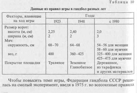 нения приемов с мячом необходимо усвоить такой бег, когда руки совершают движения независимо от темпа и ритма работы ног. В 1928 г. в Амстердаме была создана Международная любительская федерация гандбола (ИАГФ). Вначале она объединяла всего 11 стран, через два года в нее уже входило 20. Сейчас Международная федерация гандбола (ИГФ) насчитывает более 100 членов. В 1936 г. гандбол был включен в число олимпийских видов спорта. В дни первого олимпийского турнира состоялся IV конгресс Международной федерации, который наметил проведение в 1938 г. в Германии первенств мира среди мужских команд по гандболу 7x7 и 11x11. Оба чемпионата выиграли немецкие спортсмены. Война надолго приостановила развитие мирового спорта. Гандбол не был исключением. Прекратила свое существование и любительская федерация. Новый подъем в развитии игры начался в послевоенные годы с создания в 1946 г. новой Международной федерации гандбола -ИГФ. Учредительный конгресс этой федерации внес изменения в правила игры и наметил проведение первенства мира для мужских команд по гандболу 11 х 11. В первенстве мира 1948 г. во Франции участвовало 12 команд, победителем стала команда Швеции. В истории развития игры можно выделить несколько этапов: 1898-1941 гг. - зарождение, распространение и становление игры, 1946-1957 гг. - преимущественное развитие игры 11x11, 1&57-1972 гг. - распространение игры 7 х 7, с 1972 г. - современный этап широкой популярности игры во всем мире. Значительное влияние на развитие игры оказывают правила игры, инвентарь и покрытия площадок (табл. 10). пункт о «45 секундах». Все внутренние соревнования стали проводиться с учетом этого правила, что и явилось одной из причин резкого подъема мастерства советских гандболистов и побед на международных соревнованиях. Однако ускорение темпа привело к обеднению тактики команд. Новое поколение игроков перестало удовлетворять запросам мировых стандартов. И правило «45 секунд», ограничивающее время атаки, было отменено в 1986 г. сначала на соревнованиях детей, а потом и взрослых гандболистов. Одним из факторов успеха современной команды является активная защита с далеким до 9-метровой линии выходом вперед и опекой нападающих противника с целью перехватить мяч при передаче. Без такой защиты команда не может рассчитывать на успех. Вести активную защиту, плотно опекая игроков и не допуская ошибок, -дело сложное. В 1982 г. в международные правила были введены пункты, ужесточающие борьбу с любым проявлением грубости в игре. Это стимулировало мастерство защитников и нападающих, которым запрещено расталкивать обороняющихся в стремлении ближе подойти к воротам. Для изменения направления бега гандболист выставляет ногу, разноименную направлению поворота, слегка повернутую стопой внутрь. Отталкиваясь от опоры стопой, он делает поворот. Препятствия, неожиданно возникшие на пути, игрок преодолевает, передвигаясь зигзагом. Для этого перед препятствием гандболист делает шаг в сторону, а затем продолжает бег в первоначальном направлении. Если на пути нападающего встал защитник, который среагировал на этот шаг, то нападающий тут же возвращается в исходное положение и продолжает бег (рис. 123). Остановка. В связи с постоянно меняющейся ситуацией на площадке гандболисту приходится внезапно останавливаться. Остановка производится торможением одной и двумя ногами. Дл