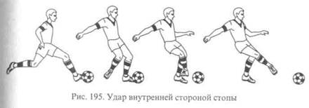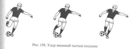 Траектория полета мяча при прямых ударах зависит от места приложения силы. Мяч полетит прямо и низом, если место приложения удара придется на среднюю часть мяча по горизонтальной плоскости. Если место приложения силы приходится ниже горизонтальной оси, то изменяется угол вылета мяча. Траектория полета мяча существенно меняется при резаных ударах. В этом случае направление удара не проходит через ОЦТ мяча, что вызывает значительное его вращение. Оно может быть вокруг горизонтальной оси (при ударе «подсечкой»), вертикальной оси (при резаных ударах низом) и наклонных осей (при ударах верхом). Знание особенностей полета мяча повышает надежность и эффективность действий футболистов. Удар внутренней стороной стопы применяется в основном при коротких и средних передачах, а также при ударах в ворота с близкого расстояния. Рассмотрим некоторые особенности техники выполнения удара (рис. 195). Место начала разбега, мяч и цель находятся примерно на одной линии. Замах выполняется за счет заднего толчка последнего бегового шага. Ударное движение начинается с одновременного сгибания бедра и поворота кнаружи (супинации) ноги. В момент удара стопа находится строго под прямым углом по отношению к направлению полета мяча. Удар выполняется серединой внутренней поверхности стопы. Положение ноги во время удара сохраняется I и во время проводки. •- Удар внутренней частью подъема используется при средних Ей длинных передачах, «прострелах» вдоль ворот и ударах по цели со всех дистанций (рис. 196). Разбег выполняется под углом 30-60° по отношению к мячу и цели. Замах ноги близок к максимальному. Опорная нога, слегка согнутая в коленном суставе, ставится на внешнюю часть (свод) стопы (подошвы). Туловище несколько наклонено в сторону опорной ноги. В момент удара условная ось, соединяющая мяч и коленный сустав, наклонена во фронтальной плоскости. Данное условие, Ш также нанесение удара в среднюю часть мяча определяют его низ- вую траекторию.
