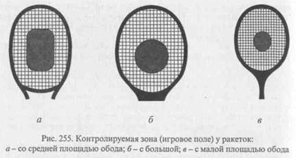 тапочки с толстой подошвой, чтобы она смягчала удары, особенно при игре на жестком покрытии. Важен рисунок рифления на подошве: он должен мешать скользить, ведь игроку приходится быстро срываться с места и внезапно останавливаться. Глубокий рисунок на подошве эффективен для игры на земляном корте. Но при игре в этих тапочках на жестком покрытии торможение становится слишком грубым. Оно может повлечь за собой травмы суставов и мышц. Чтобы не стереть ноги, избегайте слишком маленькой и слишком свободной обуви. Лучшие носки - шерстяные. Они защищают подошву от ушибов при игре на жестком покрытии и хорошо впитывают пот. Чтобы пот не стекал на глаза и ладонь, многие теннисисты надевают вязаные ободки на лоб и напульсники на правую руку. Свитер и спортивные брюки используются в холодную погоду. В них удобно делать разминку перед игрой. В перерывах между партиями такой костюм предохраняет от остывания. Следующее, на что следует обратить внимание (помимо фирмы-изготовителя) - на форму головки ракетки, ее леску, номер ручки и баланс (рис. 254). Наибольшей популярностью как среди любителей, так и профессионалов пользуется средний размер головки ракетки (гшсЫге), площадь струнной поверхности 613 кв.см, что соответствует международной маркировке 95 здлп. (рис. 255). Для новичков рекомендуют ракетки с большим размером головки (оуегаге), площадь струнной поверхности 715 кв.см, обозначается как 115 ^лп. Есте-