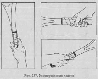 1. Игрок берет ракетку за шейку перпендикулярно продольной оси ракетки и начинает вращать ее перед собой, поворачивая в локтевом суставе предплечье вместе с кистью внутрь и наружу. Условия выполнения упражнения усложняют по мере перехватывания ракетки ближе к ручке (см. рис. 256). 2. Ракетку держат за ручку. Игрок делает рукой круги большого радиуса (от плеча) перед собой - вправо и влево, сбоку от себя -вперед и назад (правой и левой руками). 3. Игрок отводит опущенную вниз руку с ракеткой и несколько поворачивает ее внутрь в плечевом суставе. Затем начинает перемещать ракетку, сгибая и разгибая кисть. При этом продольная ось ракетки движется в вертикальной плоскости. 4. «Восьмерка» - теннисист держит ракетку обычным способом. Из исходного положения отводит и несколько разгибает кисть в лу-чезапястном суставе, как при замахе при ударе справа. Затем он немного поворачивает предплечье в локтевом суставе наружу. При этом головка ракетки поднимается вверх. Получается своеобразный мини-удар справа. После того как ракетка дошла до средней линии тела спортсмена, он продолжает сгибать кисть и поворачивает предплечье еще немного наружу. При этом головка ракетки поднимается влево вверх. И наконец, поворачивая предплечье внутрь и опуская головку ракетки, теннисист завершает один цикл движения. Таким образом, благодаря движениям кисти и предплечья головка ракетки описывает «восьмерку» во фронтальной плоскости. Упражнения с ракеткой и мячом сводятся к различным подбива-ниям мяча. Используйте при этом универсальную (рис. 257) или западную хватку - для ударов справа и восточную - для ударов