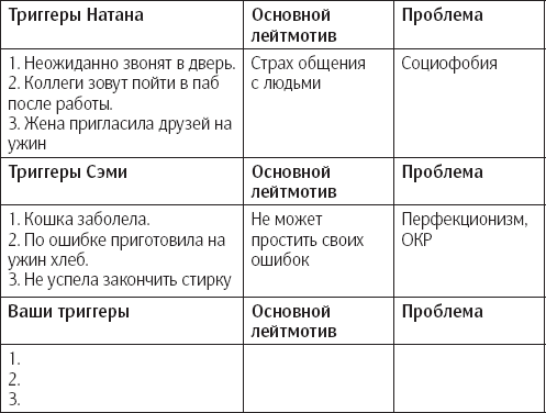 • запускают неадекватную эмоциональную реакцию; • приводят к нежелательному поведению; • приводят к перемене настроения. Вот еще два примера классических триггеров, представленных с точки зрения КПТ и проанализированных со спокойствием Спока: