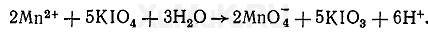 Ионы марганца, содержащиеся в минерализатах, определяют при помощи реакций с периодатом калия и персульфатом аммония. После окисления ионов марганца этими реактивами образуются перманганат-ионы, имеющие фиолетовую окраску. Обе реакции являются специфичными для обнаружения ионов марганца, так как катионы других металлов при окислении указанными реактивами не дают фиолетовой окраски. Реакция с периодатом калия КIO 4. При взаимодействии ионов марганца с периодатом калия образуется темно-красный осадок. Образование этого осадка происходит главным образом в сильно разбавленных растворах соединений марганца. В присутствии фосфатов не образуется этот осадок, а происходит окисление ионов марганца Mn 2+ до MnO 4 -: