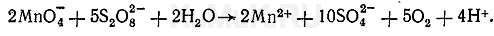 Ионы железа (III), которые могут быть в минерализатах в больших количествах, затрудняют распознавание окраски перманганатионов. Для маскировки ионов железа прибавляют фосфаты, которые с ионами железа образуют бесцветный комплекс [Fe(РО 4) 2 ] 3-. Реакции окисления ионов марганца персульфатом мешают восстановители, обесцвечивающие перманганат-ионы, а также хлориды, бромиды и другие ионы, которые осаждают ионы серебра, являющиеся катализатором. На протекание реакции персульфата с ионами марганца влияет рН среды. Эта реакция хорошо протекает в 3 н. кислоте. При недостаточной кислотности образуется темно-бурый осадок марганцовистой кислоты Н 2 MnO 4, а при большом избытке кислоты может происходить восстановление перманганат-ионов персульфатом: