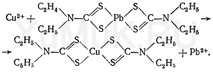 В химико-токсикологическом анализе обнаружение ионов меди основано на выделении их из минерализата в виде диэтилдитиокарбамата, который экстрагируют хлороформом, а затем разлагают хлоридом ртути (II). Освободившиеся при этом ионы меди определяют при помощи соответствующих реакций. Выделение ионов меди из минерализата. К минерализату прибавляют раствор диэтилдитиокарбамата свинца. При этом образуется диэтилдитиокарбамат меди: