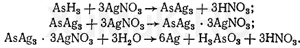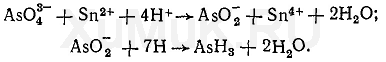 Скорость восстановления соединений трех-и пятивалентного мышьяка (арсенитов и арсена-тов) водородом неодинаковая. Арсениты восстанавливаются водородом легче, чем арсенаты. Поэтому вначале производят восстановление арсенатов в арсениты водородом в присутствии солей железа (II) или олова (II), затем арсениты восстанавливаются водородом с образованием мышьяковистого водорода: