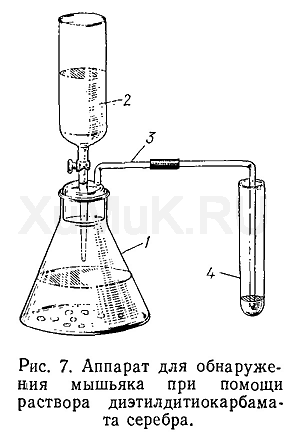 При дальнейшей обработке бумаги концентрированным раствором иодида калия бумага обесцвечивается (образуется K 2 [HgI 4 ]), а пятно, содержащее соединения мышьяка AsH 2 (HgCl), AsH(HgCl) 2, As(HgCl) 3, остается желтым или коричневым. Реакции Зангер — Блека мешает сероводород, который может образоваться при взаимодействии водорода с серной кислотой: H 2 SO 4 + 8Н ---> H 2 S + 4Н 2 О. Реакции Зангер — Блека также мешают соединения, ионы которых восстанавливаются водородом. Сереводород, выделившийся при взаимодействии водорода с серной кислотой, на фильтровальной бумаге реагирует с хлоридом или бромидом ртути (II). В результате этой реакции образуется черного цвета сульфид ртути, который маскирует окраску пятен, содержащих соединения мышьяка. Для связывания сероводорода применяют вату, пропитанную раствором ацетата свинца: H 2 S + Pb (CH 3 COO) 2 ---> PbS + 2СН 3 СООН Выполнение реакции. В колбу аппарата Зангер — Блека вносят 2 мл минерализата, 10 мл 4 н. раствора серной кислоты, 5 мл воды и 1 мл 10 %-го раствора хлорида олова (II) в 50 %-й серной или соляной кислоте. Затем в колбу аппарата вносят 2 г мелких гранул «купрированного» цинка. Колбу аппарата закрывают насадкой, в которую вложена бумага, пропитанная хлоридом или бромидом ртути (II), а ниже вставлен тампон ваты, пропитанный ацетатом свинца. Аппарат оставляют на время, необходимое для образования на бумаге буровато-коричневого пятна. При наличии больших количеств мышьяка в пробе это пятно может появиться через несколько минут. При малых количествах мышьяка в минерализате пятно появляется через 30—45 мин. Если и через 45 мин не появится пятно, то бумагу опускают в 3 %-й водный раствор иодида калия. При этом бумага приобретает красноватую окраску. Затем бумагу опускают в насыщенный раствор иодида калия. При наличии мышьяка в минерализате на бумаге остается желтое или коричневое пятно, а вокруг него исчезает красноватая окраска. Предел обнаружения: 0,1 мкг мышьяка в пробе. Граница обнаружения: 0,01 мг мышьяка в 100 г биологического материала. Приготовление «купрированного» цинка (см. Приложение 1, реактив 61). Приготовление бумаги, пропитанной раствором хлорида или бромида ртути (III) (см. Приложение 1, реактив 7). Приготовление ваты, пропитанной раствором ацетата свинца (см. Приложение 1, реактив 8). Реакция с раствором диэтилдитиокарбамата серебра в пиридине. При выполнений этой реакции находящиеся в минерализате соединения мышьяка восстанавливают до мышьяковистого водорода, который собирают в пробирку (приемник), содержащую свежеприготовленный раствор диэтилдитиокарбамата серебра в пиридине. Раствор диэтилдитиокарбамата серебра в пиридине не должен содержать влаги. При наличии мышьяка в минерализате раствор диэтилдитиокарбамата серебра приобретает устойчивую красно-фиолетовую окраску. Химизм этой реакции не выяснен. Обнаружению мышьяка при помощи этой реакции мешают соединения сурьмы, которые тоже реагируют с указанным реактивом и дают оранжево-красную окраску. Сурьма дает эту реакцию тогда, когда содержание ее в 100 г биологического материала составляет 0,5 мг и выше. Восстановление соединений мышьяка при этой реакции происходит под влиянием водорода, условия получения которого подробно приведены при описании реакции Зангер — Блека. Реакцию соединений мышьяка с диэтилдитиокарбаматом серебра выполняют в специальном аппарате (
