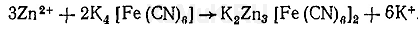 Диэтилдитиокарбамат цинка экстрагируют хлороформом, а затем разлагают кислотой. Выделившаяся при этом диэтил-дитиокарбаминовая кислота в кислой среде быстро разлагается на диэтиламин и сероуглерод. Для маскировки ионов других металлов, которые тоже экстрагируются из минерализата в виде диэтилдитиокарбаматов, прибавляют растворы сегнетовой соли и тиомочевины или же растворы лимонной кислоты и тиосульфата натрия. Способ выделения ионов цинка из минерализата описан ниже. В делительную воронку вносят 10 мл минерализата, 4 мл 10 %-го раствора сегнетовой соли (или 4 мл 20 %-го раствора лимонной кислоты) и 1 мл насыщенного раствора тиосульфата натрия. К. этой смеси добавляют несколько капель индикатора (0,1 %-ый раствор нильского голубого), а затем по каплям добавляют 2,5 н. раствор гидроксида натрия до появления розовой окраски. К содержимому делительной воронки добавляют 2 н. раствор серной кислоты до рН = 8,5 (по универсальному индикатору), 3 мл 1 %-го раствора диэтилдитиокарбамата натрия в смеси воды и спирта (3:1) и 5 мл хлороформа. Содержимое делительной воронки интенсивно взбалтывают, а затем хлороформный слой отделяют от водной фазы и переносят в другую делительную воронку. К хлороформному слою прибавляют 10 мл воды и взбалтывают. Водную фазу отделяют от хлороформного слоя, к которому прибавляют 3 мл 1 н. раствора соляной кислоты, а затем взбалтывают в течение 0,5 мин. После взбалтывания от хлороформной фазы отделяют водную фазу, в которой определяют наличие ионов цинка при помощи реакций с гексацианоферратом (II) калия, сульфидом натрия и тетрароданомеркуроатом аммония. Реакция с гексацианоферратом (II) калия. К 1 мл водной фазы добавляют 5 %-й раствор гидроксида калия до рН = 5 (по универсальному индикатору) и 3—4 капли 5 %-го раствора гексацианоферрата (II) калия. При наличии ионов цинка выделяется белый осадок: