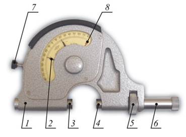 Порядок выполнения работы 1. Рассчитать исполнительные размеры калибра. 2. Измерения калибра производить с помощью рычажной скобы. Рычажная скоба (рис. 22) предназначена для измерения и контроля наружных размеров изделия. Скобка представляет собой прибор с подпружиненной пяткой 3 и передвижной пяткой 4. Перемещение подпружиненной пятки передается на стрелку 8 рычажно-зубчатого механизма, находящегося в корпусе 1. Величину перемещения подпружиненной пятки определяют по шкале. Скобка имеет арретир 7, отводящий подпружиненную пятку при установке между пятками измеряемого изделия или блока концевых мер длины.