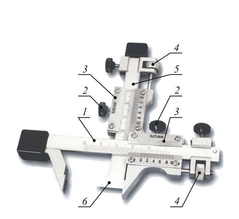 Штангензубомер кромочный (см. рис. 30) состоит из вертикальной 5 и горизонтальной 1 штанг, по которым перемещаются рамки с нонинусами 3, устройствами для микроподачи нониуса 4 и стопорными винтами 2. К рамке нониуса вертикальной штанги прикреплена опорная планка 6.