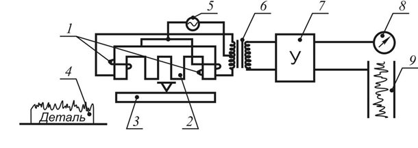 Принцип работы профилографа – профилометра модели 201 основан на ощупывании исследуемой поверхности алмазной иглой и преобразовании колебаний иглы в измерения напряжений индуктивным методом. Алмазная игла 4 (рис.32) перемещается по поверхности детали. Ее колебания с помощью датчика, состоящего из сердечника 2, катушек 1, коромысла 3, преобразуются в колебания напряжения на выходе трансформатора 6. При проходе колебаний через усилитель 7 они фиксируются показывающим устройством 8 или записываются с некоторым увеличением на профилограмме с помощью записывающего устройства 9.
