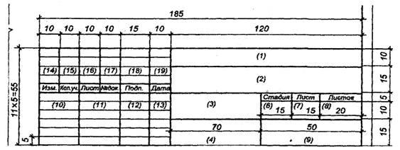 Рисунок 14 Согласно ГОСТ 21.101-97 (в графах основной надписи указывают: Графа 1 – обозначение документа (основного комплекта рабочих чертежей, чертежа изделия, текстового документа и т. п.) (см. п. 8.1.3). Графа 2 – наименование предприятия (в том числе учреждения и предприятия обслуживания), в состав которого входит здание (сооружение), или наименование микрорайона, где оно находится; Графа 3 – наименование здание (сооружения); Графа 4 – точное наименование изображений, помещенных на данном листе; Графа 5 – наименование изделия и (или) наименование соответствующего документа; Графа 6 – условное обозначение стадии проектирования (П - проектная, Р - рабочая документация, У - учебный); Графа 7 – порядковый номер листа или страницы текстового документа при двухсторонней печати (на документах, состоящих из одного листа, графу не заполняют); Графа 8 – общее число листов документа (заполняют только на первом листе). На первом листе текстового документа при двусторонней печати указывают общее число страниц; Графа 9 – наименование или различительный индекс организации, разработавшей документ (см. 8.1.3); Графа 10 – характер работы (разработал, проверил, нормоконтроль, консультант, утвердил); Графа 11…13 – фамилии и подписи лиц, указанных в графе 10, и дата подписания.